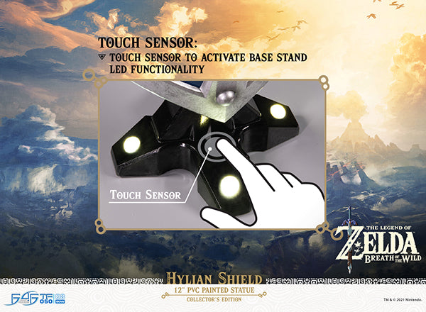 As for the base it's mounted on, the Hylian Shield attaches magnetically to the display stand it comes with, which is simple by design but perfectly accentuates the shield itself. The Collector's Edition of this statue comes with bright LED functionality beneath the gold rivet details of the stand, giving the shield an even more majestic look! The Legend of Zelda: Breath of the Wild - Hylian Shield (Collector's Edition) comes with the following: